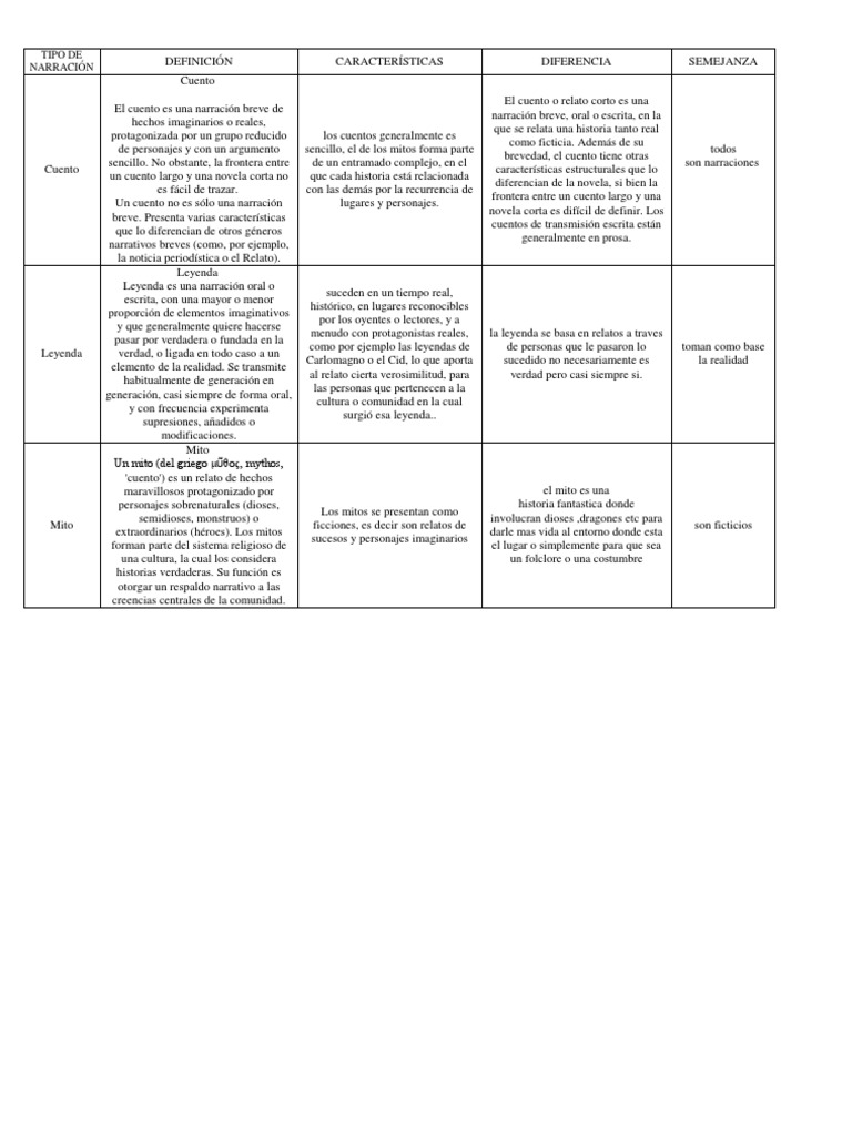 Cuadro Comparativo De Mito Leyenda Cuento