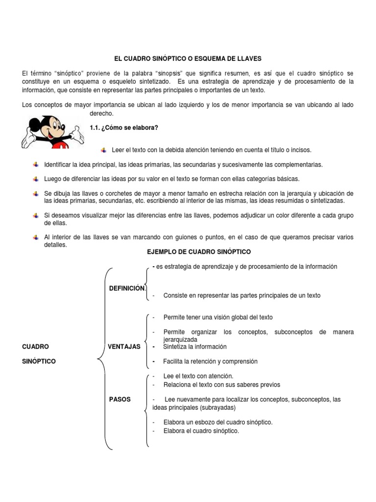 De un solo golpe de vista se adquiere una vision grafica del contenido de un tema cuyas ideas han sido ordenadas y jerarquizadas. Que es un cuadro sinoptico. Podemos hablar en primer lugar de llaves o cuadro sinoptico que resulta muy util cuando estamos frente a muchas subdivisiones o bien en segundo lugar de un esquema ramificado o diagr ama que simplifica reconocer las relaciones entre conceptos de una manera grafica como lo es el caso de. Cuando necesitamos representar un proceso o una actividad que se realiza por pasos o ciclos.